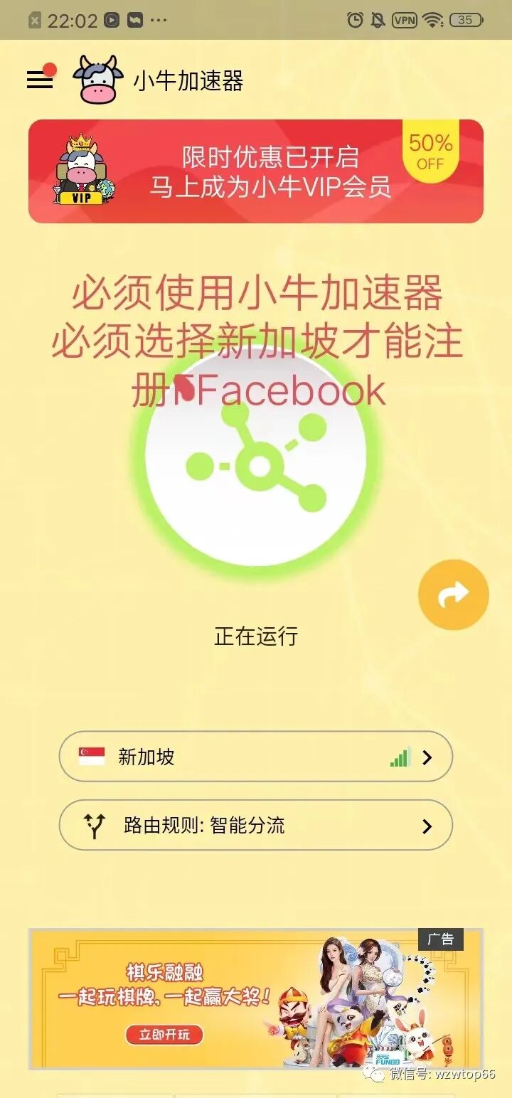1、在国内注册facebook,必须先解决网络问题,也就是伽速器(代理ip)。我是用小牛加速器,同时选择国家新加坡。