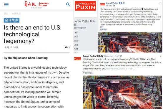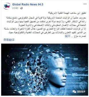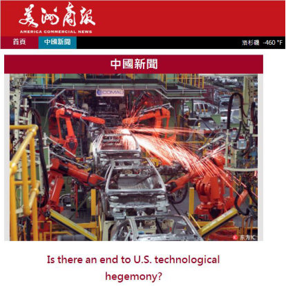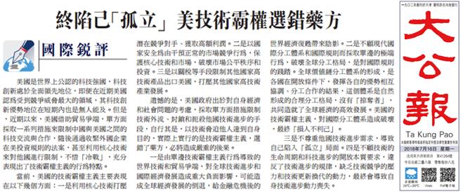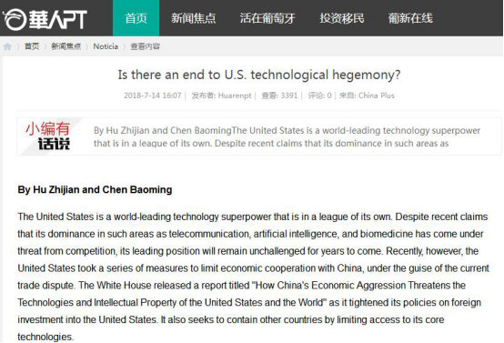 中央广播电视总台发表题为《国际锐评:美国的技术霸权主义要走向何方》的评论文章。文章指出,美国是世界上公认的科技强国,科技创新处于全面领先地位,即便在近期美国认为受到竞争威胁最大的领域,比如信息通信、人工智能、生物医药等,其科技创新优势地位在短期内也是无人能及。但是,近期以来,美国借助贸易争端,单方面采取一系列措施来限制中国与美国之间的科技交流与合作,发布了《中国的经济侵略如何威胁美国和世界的技术与知识产权》报告,随后通过收紧外国企业在美投资规则的法案,甚至利用核心技术来对他国进行限制,不惜“冷战”,充分表现出了技术霸权主义的行为特点。