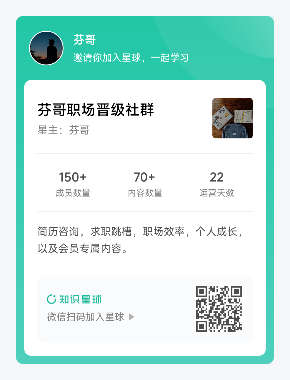 欢迎大家加入我的职场星球,这是我在英语星球之外新开的第二个星球,专业解答分享简历咨询,求职跳槽,职场效率,个人成长方面的内容,加入职场星球后限时50元即可加入我的商务英语星球。