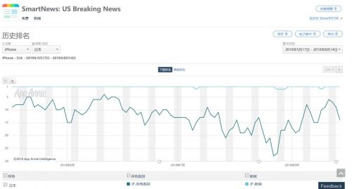 关于 SmartNews,国内的开发者可以把它看做“日本的今日头条”。根据 App Annie 数据,2012 年就已经在日本上线的 SmartNews 在日本的新闻聚合市场一直处于霸主地位,近 90 天一直徘徊在 iOS 日本新闻类 app Top 2,在下载总榜也多徘徊在前20。