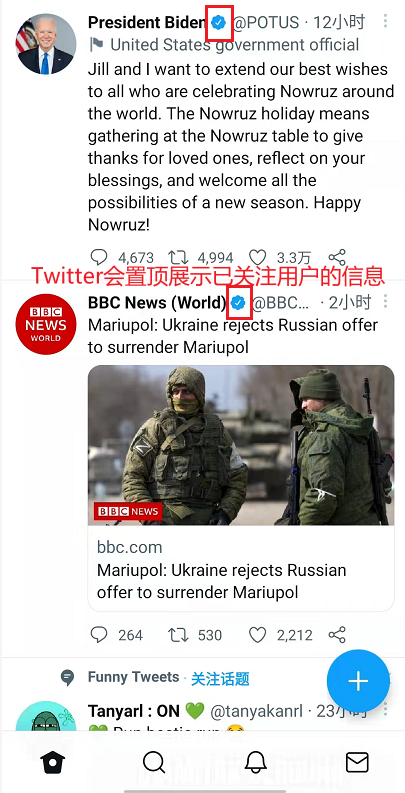 Twitter 也十分注重“关注”逻辑,如果用户关注的博主发布了最新推文,会被排在首页前面。同时,当用户和某位博主互动越多,算法就会更多地为你推荐那位博主所关注的内容。