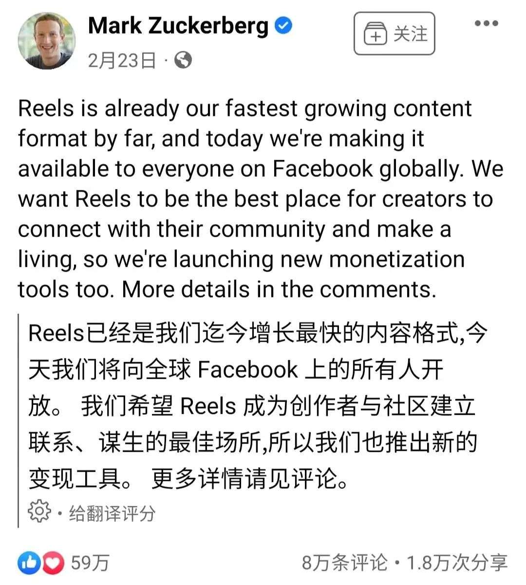 在今年 2 月,扎克伯格在 Facebook 上宣布“ Reels 已成为我们增长最快的内容形式”。
