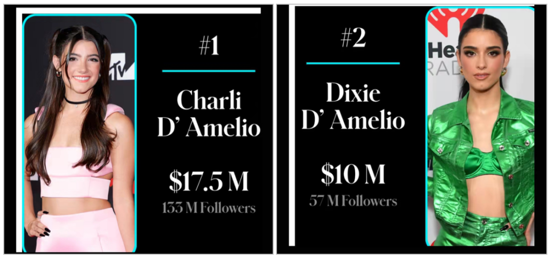 在收入榜单上的第一名 Charli D’Amelio 和第二名 Dixie D’Amelio 其实是一对姐妹花。