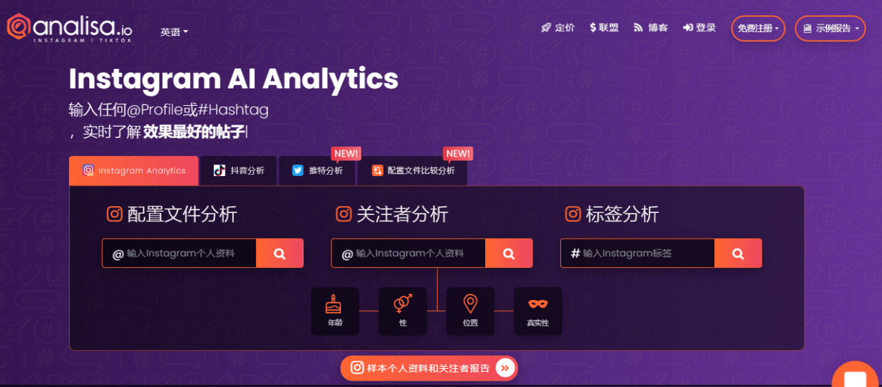 Analisa是分析tiktok和Instagram博主、达人数据的渠道。数据相对全面,可以做关键词分析,可以分析到半年前的数据,分析的维度也比较多。它仅支持英文,分为免费版和付费版,功能齐全,但成本高。提供博主活动综合报告、粉丝真实性评价、参与性、内容和竞争对手分析。