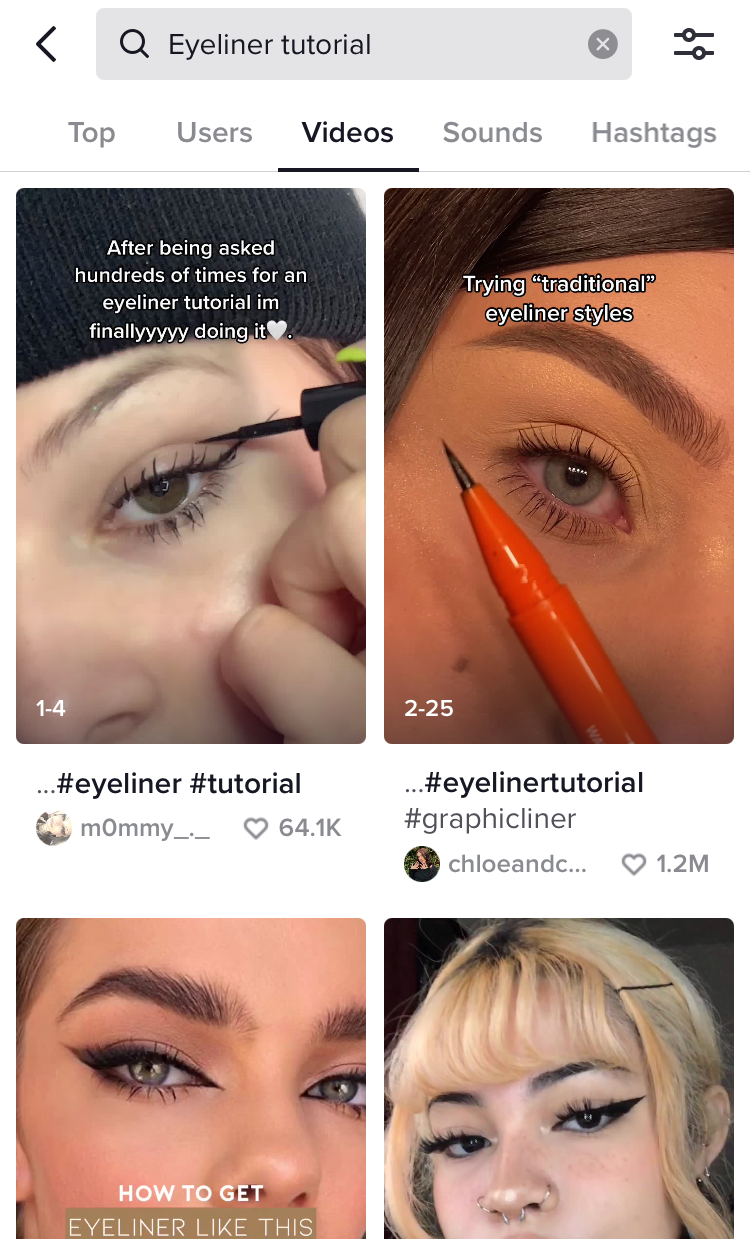 比如:你的视频添加了【#eyeliner tutorial】的标签,这个视频将会归入到eyeliner tutorial主题标签下。