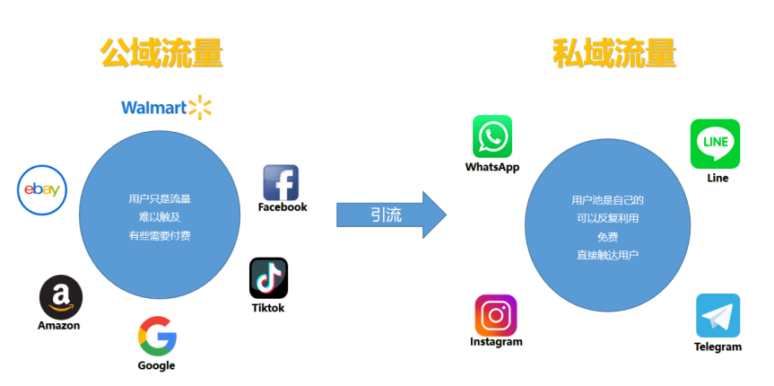 可能有的同学还不太了解公域和私域流量的区别,举个例子,像亚马逊、Ebay、TikTok这些都是属于平台流量,是公共的。你可以在里面发布内容,免费获取用户,甚至是付费,例如百度、Google、Facebook,如果你想要自己的内容排到前面,就需要付费去做竞价排名。