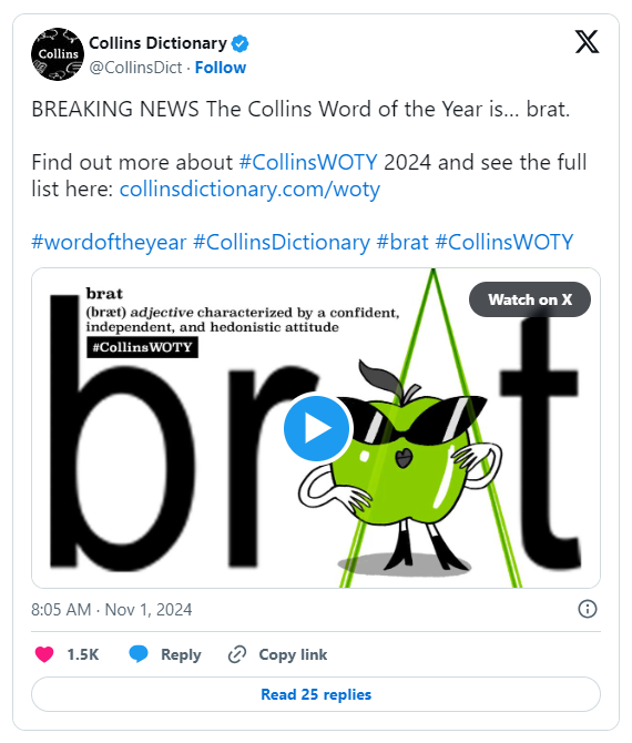 前不久,英国知名词典柯林斯(Collins Dictionary)还将「brat」评选为年度词汇。柯林斯词典在其网站上表示,这是2024年被最多谈及的词汇。