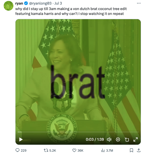 而TikTok则让“brat summer”这一趋势风靡全球,甚至连美国总统候选人卡马拉·哈里斯的竞选宣传也借用了这一潮流。短短几个月内,#brat 标签下已经涌现出超过140万条相关内容,标志着这一流行文化现象的强劲势头。