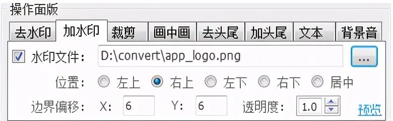 加水印此功能可以为视频加上音乐 Logo 标记,支持静态图片及 gif 动图。