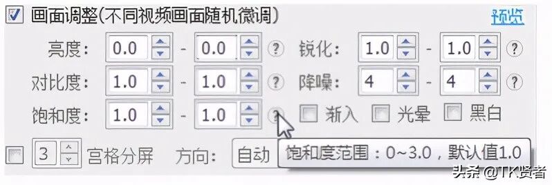 画面调整此处设置可以对视频画面亮度、对比度、饱和度及锐化、降噪等进行微调,并可设置其入场效 果、光晕、黑白画面等,以达去重之目的。