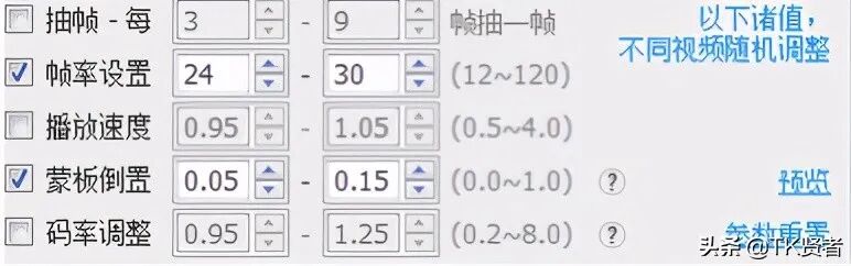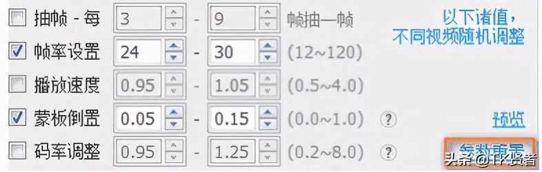 参数重置其功能恢复视频处理诸参数为初始值,仅勾选[帧率设置]与[蒙板倒置]。
