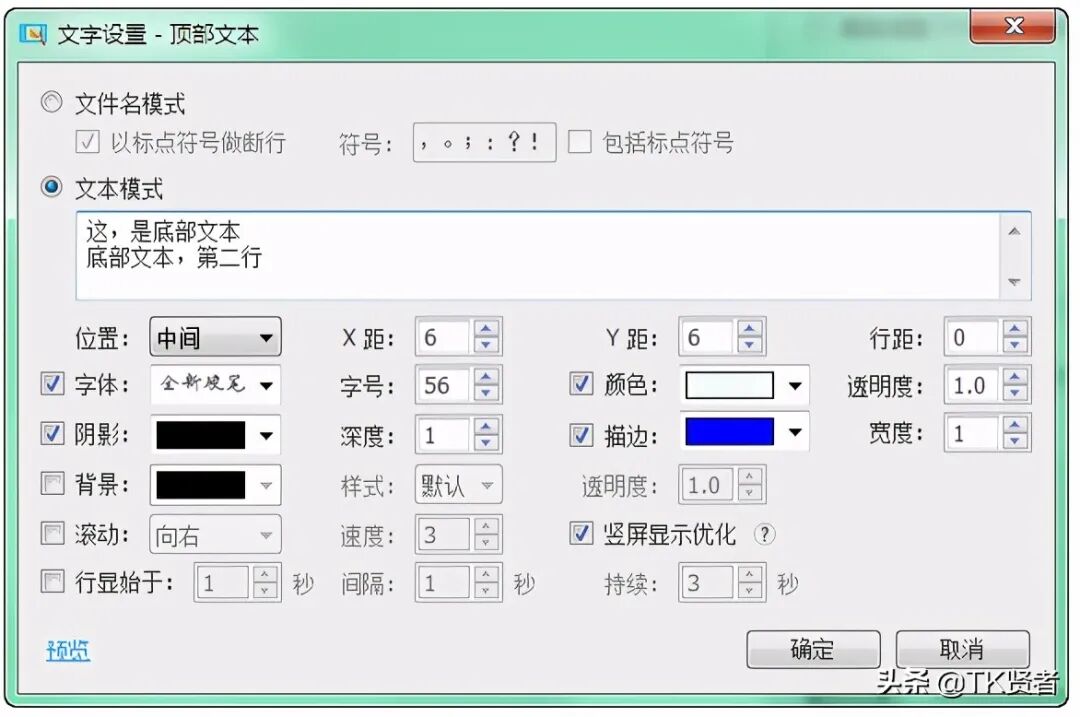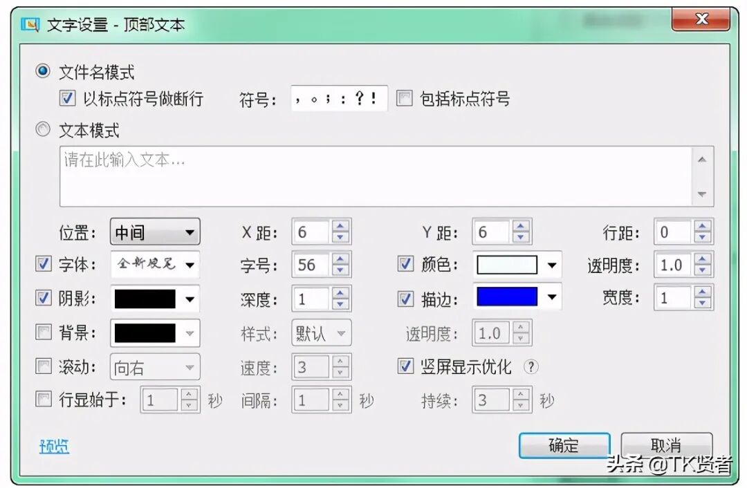 您可以设置需要显示文本的样式,甚至于分行、延时显示。其风格尽在[设置]中,此页面亦可以 对其进行预览。文本支持两类:以文件名做文本及自定义文本。若是文本名模式,则可设置断行文本,并可勾选[竖屏显示优化],以优化其布局效果。