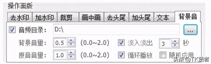 程序会寻找其下的 mp3 与 m4a 文件,根据设定合成入视频中。音乐播放,可设置其淡入淡出效果,并可循环播放。若勾选[随机应用],则目录里面的音乐,会随机合成进导入的视频中。