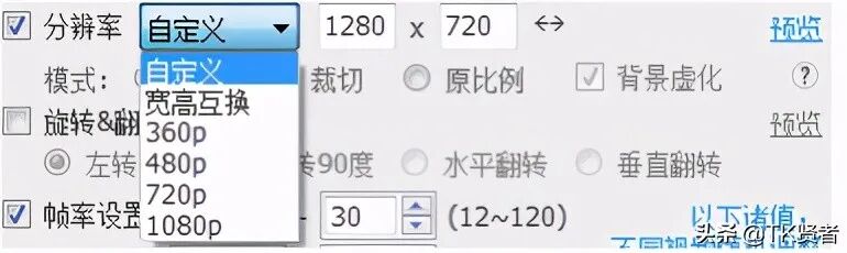 此处设置视频输出的分辨率。您可以自定义需要输出的视频大小,亦可选择标准的视频分辨率 格式。
