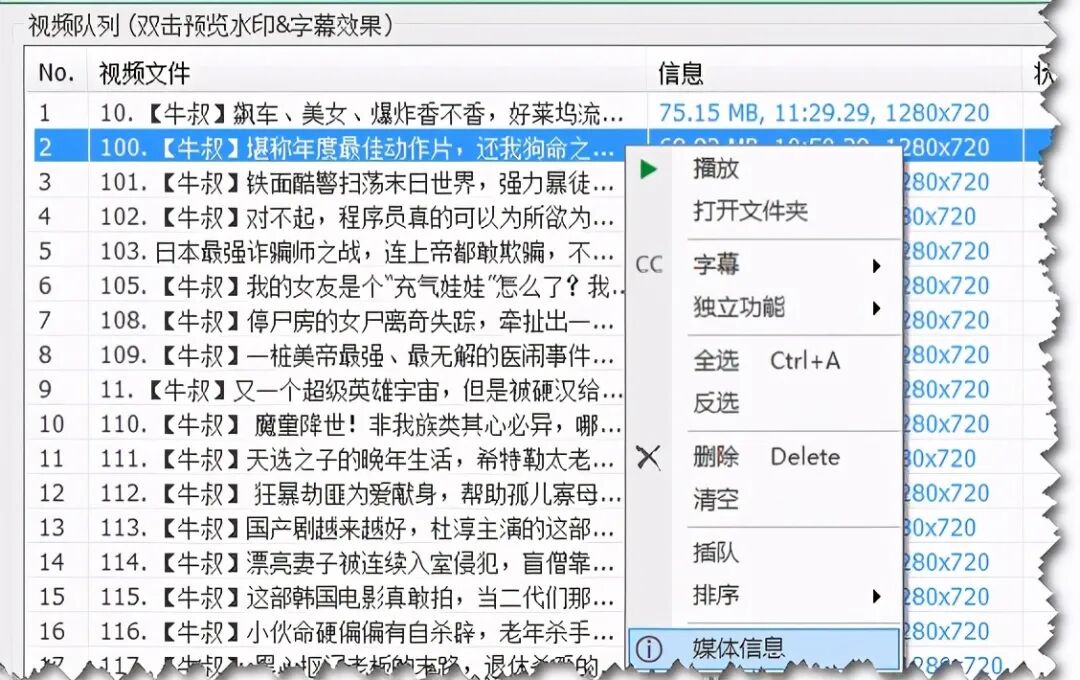 在这里,你可以对导入的视频队列进行预览、字幕设置、合并、分割、静音片段去除、全选& 反选、删除、清空、插队、排序、查看视频信息等操作