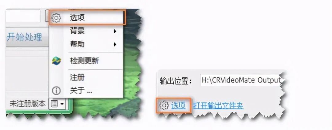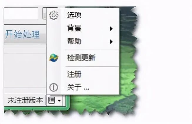 主界面分为视频队列区、操作面板区、处理记录区与状态栏。用户导入视频至视频列表中,设置转换参数,点击[开始处理],静待处理即可。右下角为功能菜单,选项、背景、帮助、注册、关于等项列于其中。