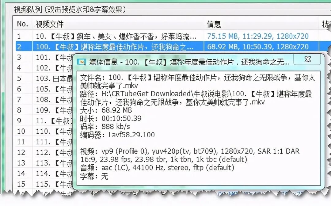 之后,视频被导入列表中,并显示其相关信息:
