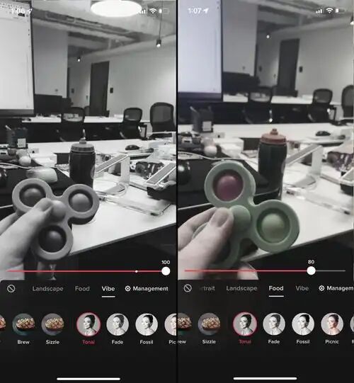 TikTok根据这些需求,预设了四个不同的滤镜类别:肖像、风景、食物和氛围。大家可以根据需求添加对应的滤镜。
