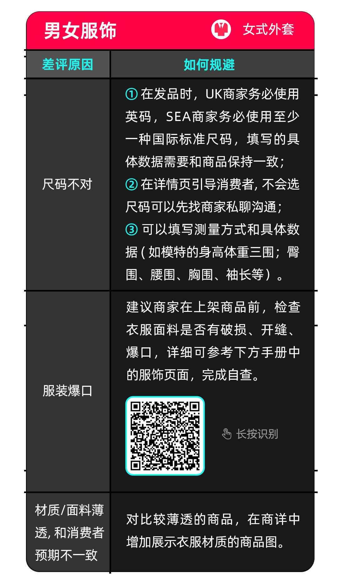 a、材质/面料薄和消费者预期不一致; b、有色差; c、尺码不对;