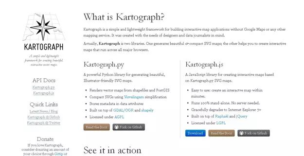 Kartograph是一个用于创建无人操控、交互式地图(如:谷歌地图)的框架。它由两个库组成:一个是Python库,从形式函数或Post GIS中提出矢量地图,并把它们转换成SVG格式;另一个是JavaScript库,将这些SVG格式转换成交互式地图。