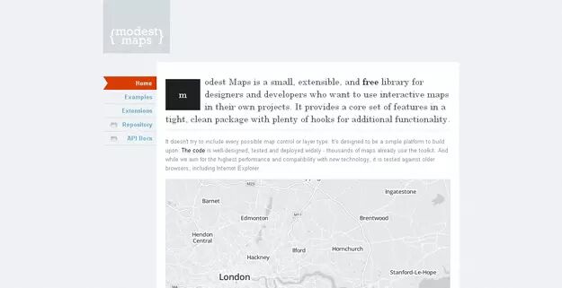 Modest Maps是一个轻量级、可扩展的、可定制的和免费的地图显示类库,这个类库能帮助开发人员在他们自己的项目里能够与地图进行交互。ModestMaps提供一个核心健壮的带有很多hooks与附加functionality函数的要素开发包。