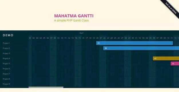 Gantti是一个开源的PHP类,帮助用户即时生成Gantt图表。使用Gantti创建图表无需使用JavaScript,纯HTML5-CSS3实现。图表默认输出非常漂亮,但用户可以自定义样式进行输出(SASS样式表)。