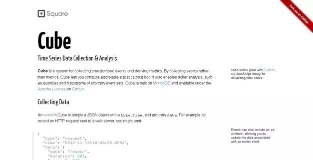 Cube是一个开源的系统,用来可视化时间系列数据。它是基于MongoDB、NodeJS和D3.js开发。用户可以使用它为内部仪表板构建实时可视化的仪表板指标。例如,你可以使用Cube去监控网站流量,统计每5分钟的请求数量等。