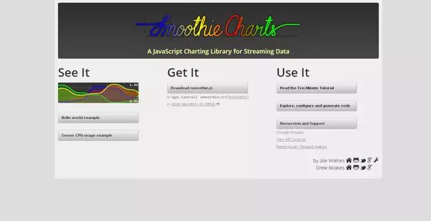 Smoothie Charts是一个十分小的动态流数据图表库。通过推送一个WebSocket来显示实时数据流。Smoothie Charts只支持Chrome和Safari浏览器,并且不支持刻印文字或饼图。它很擅长显示流媒体数据。