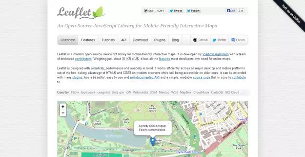 Lefalet是一个开源的JavaScript库,用来开发移动友好地交互地图。它是由 Vladimir Agafonkin 带领一个专业贡献者团队开发,虽然代码仅有31 KB,但它具开发在线地图的大部分功能。