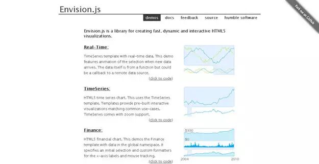 Envision.js 是个基于 Flotr2 和HTML5的JavaScript库,用来简化、快速创建交互式的 HTML5 可视化图表。它包括两个图表类型:时序图和Finance,提供API给开发者,用户可以直接自定义创建图表。