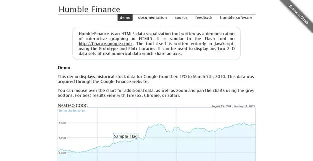 HumbleFinance是HTML5数据可视化编译工具。作为交互式图形的范本,与Flash工具类似,工具本身是用JavaScript编译的,使用Prototype和Flotr库,它可以用于显示实际数值共享一个轴的任意两个2D数据集。
