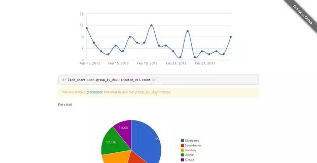 Chartkick是一个图表绘制工具,特点是UI美观、使用简单,并且支持IE6在内的大多数浏览器。它还可以与开源框架Django、Flask/Jinja2结合使用。可以让你用最少的代码创建专业的JavaScript图表,甚至只需要一行Ruby代码即可绘制出漂亮的图表!