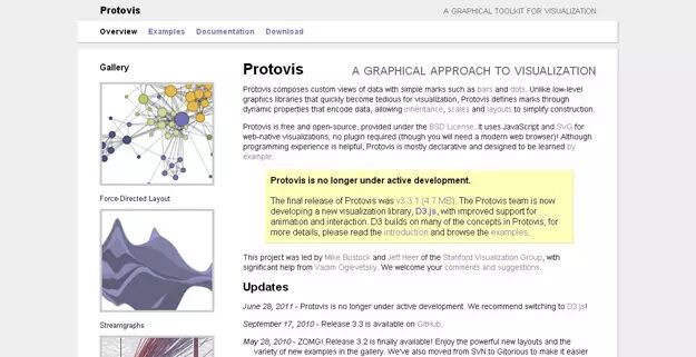 Protovis是一个使用JavaScript Canvas元素实现的可视化组件。开发者可以利用简单的标记如线条和圆点+数据来绘制自定义图表。