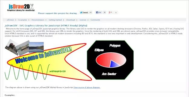 jsDraw2DX是一个标准的JavaScript库,用来创建任意类型的SVG交互式图形,可生成包括线、举行、多边形、椭圆、弧线等等图形。