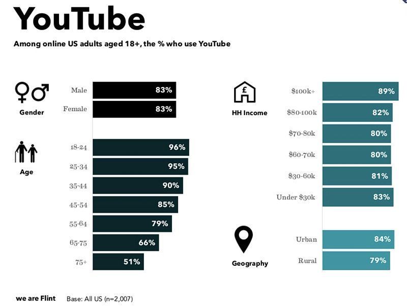Youtube在17年6月,18年7月和19年5月的月活分别为15亿,19亿和20亿,其中约80%来自美国以外。细心的读者可能已经发现按这个比例计算18年美国的用户数应该有3.8亿,已经超过美国本国人口3.28亿。个人推测原因是用户可能同时拥有多个YouTube账号,这在美国也比较常见,用户只需要有Gmail账号就能关联YouTube账号。YouTube在美国的真实渗透率可以参考We are flint在2018年初的调查如下图(样本个数为2007),几乎在每个18+的年龄层和收入群体都保持了非常高的渗透率。Pew Research Center在19年初的报告中推测YouTube在美国成人中的渗透率为73%.