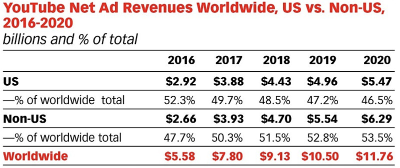 收入方面,eMarketer推测18年达到95亿美元,也有谷歌内部分析师透露为140亿美元。收入中广告占90%以上,其余来自订阅。下图为eMarketer整理的2016至2018美国和其他地区的广告收入对比。其中来自美国的收入约占全部收入的1/2且比例逐年略有下降。对美跨国公司熟悉的朋友应该不会惊讶美国贡献的收入比例。
