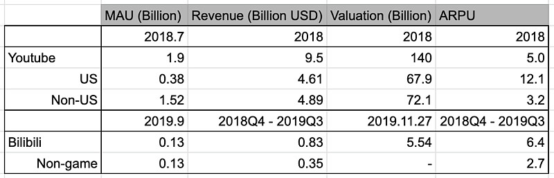 YouTube的数据主要来自2018年,采用整体1400亿美元的估值,并分解成美国和其他地区,美国的月活占比20%,估值是按收入比例分解。1400亿的估值来源于Needham相对看好谷歌的Laura Martin,2018年大摩的分析师也曾给出过1600亿估值。B站的数据来自2018Q4至2019Q3,并单独列出非游戏收入,汇率按照0.14计算。具体估值数据整理如下,其中ARPU为时间区间内的总收入/月活。
