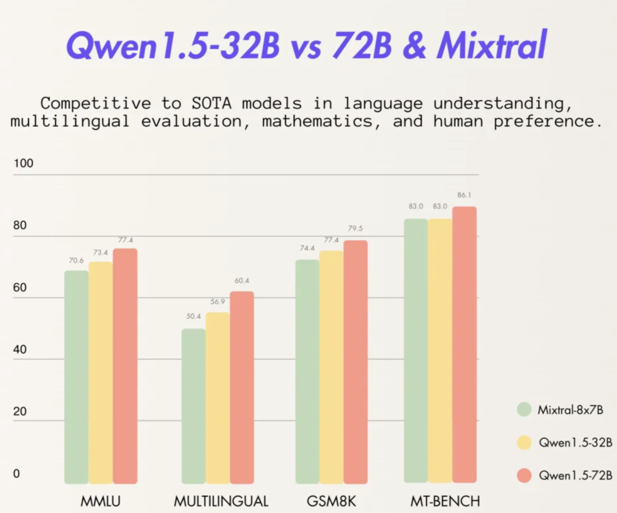 阿里云通义千问今日开源320亿参数模型Qwen1.5-32B,可最大限度兼顾性能、效率和内存占用的平衡,例如相比14B模型,32B在智能体场景下能力更强;相比72B,32B的推理成本更低。迄今通义千问共开源了7款大语言模型,在海内外开源社区累计下载量突破300万。