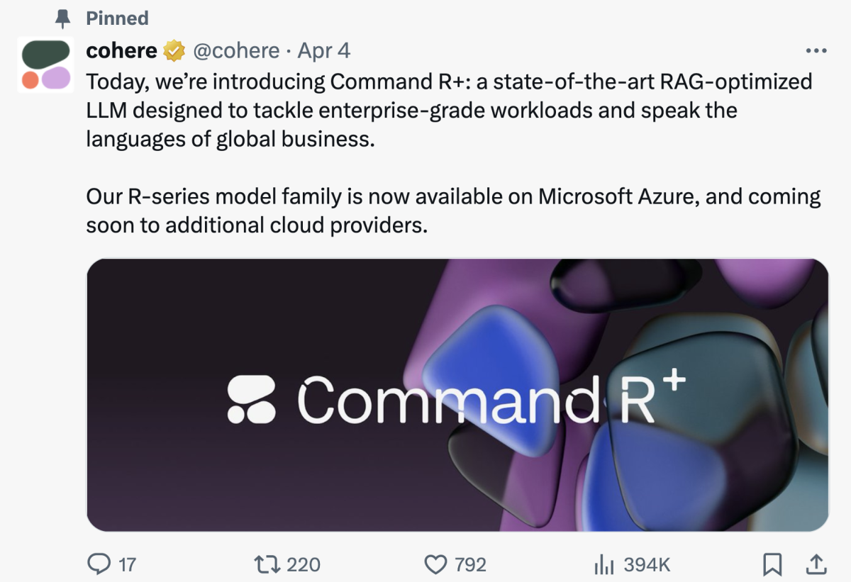 根据AI独角兽Cohere官网,Cohere于4月4日推出Command R+,一种先进的高级检索增强生成 (RAG)优化的大语言模型,也是该公司目前最强大、可扩展的大型语言模型。该模型具有128k tokens上下文窗口,提供RAG并被加入引用以减少幻觉,支持10种主要语言多语言覆盖,支持全球业务运营,并可用于自动化复杂业务流程。Command R+系列现已在微软Azure上提供,并且很快将向其他云提供商提供。