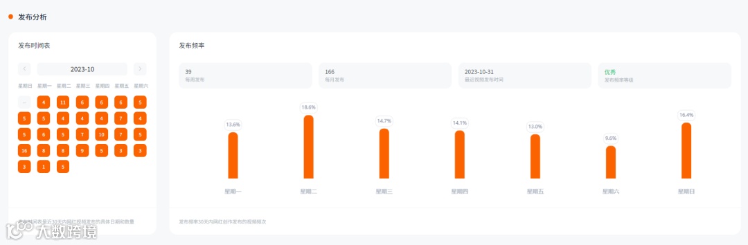 视频发布频次也就是指网红更新视频/贴文的周期,通常用来衡量网红频道的活跃度。