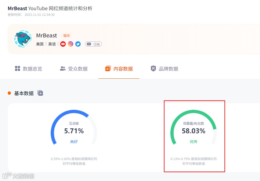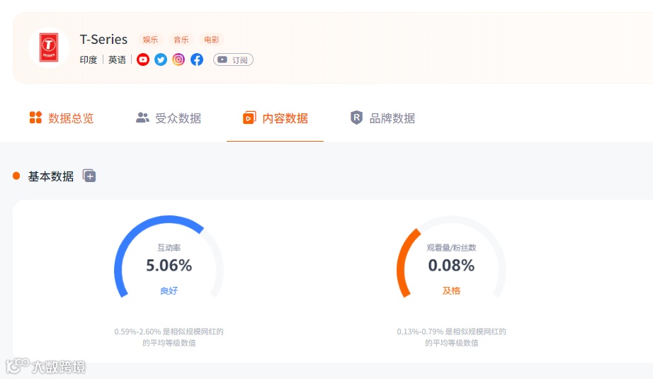 观看订阅比指的是网红平均观看量与粉丝数的比值,通常用于衡量网红的内容质量以及号召力。一般来说,在平均观看量达到预期时,观看订阅比数值越高的频道表现越好。