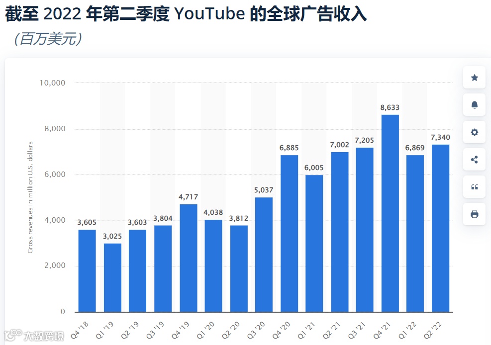 YouTube将55% 的广告收入分配给创作者,丰厚的激励与创作回报引发了用户创作内容的井喷式增长。2021 年,收入至少10,000 美元的 YouTube 频道数量同比增长超过 40%。
